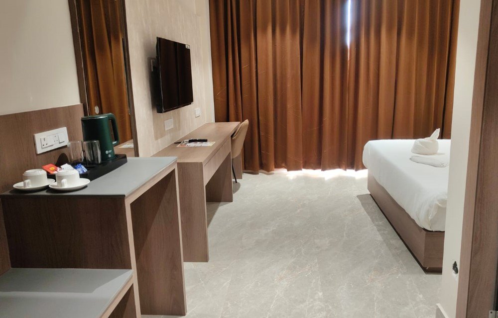 The overall feel of the Deluxe hotel room in Bagdogra is grounded and comfortable rather than overstated. Windows allow natural daylight to filter in during the day, while curtains provide privacy and control over light when rest is needed. The room is well-suited for travelers looking for a comfortable hotel room near Bagdogra Airport, offering an atmosphere that supports rest, focus, and ease of stay without unnecessary distractions.