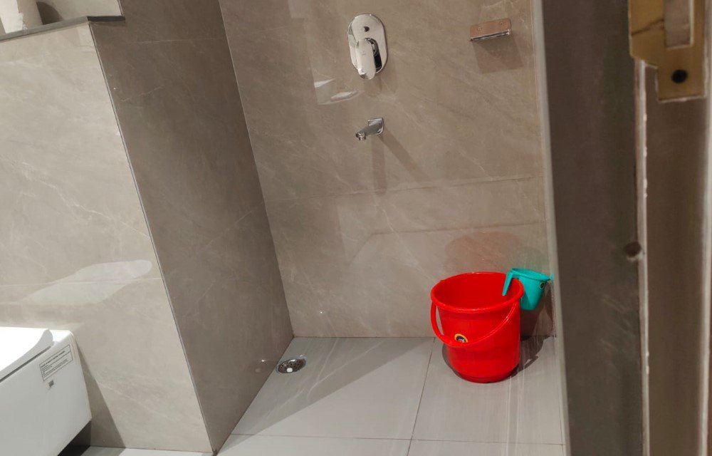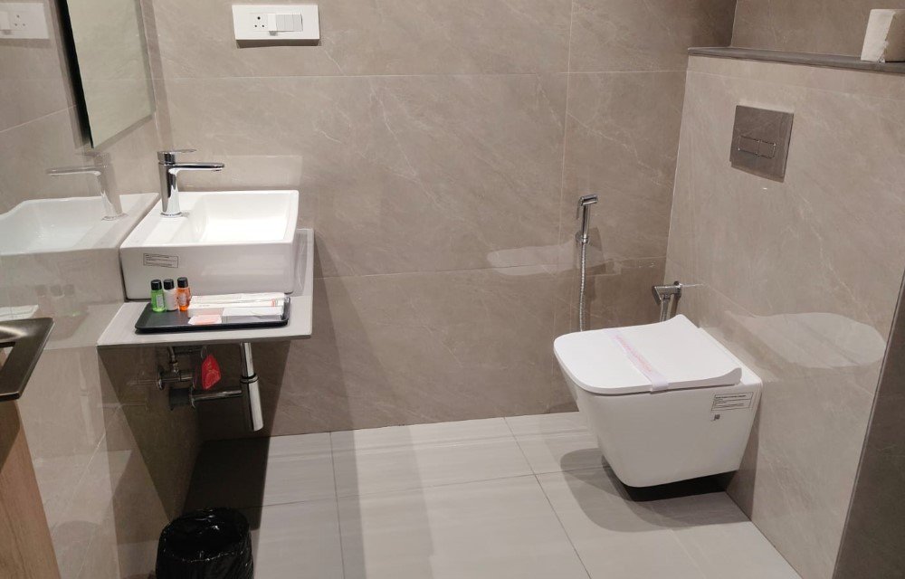 The bathroom flooring and wall finishes are selected for safety and hygiene, making it comfortable for guests of all age groups. This practical setup supports both short stays and extended visits, aligning well with the expectations of guests searching for a reliable hotel room in Bagdogra, West Bengal.
